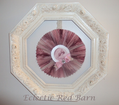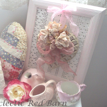 However, I did combine a vintage frame and a vintage crocheted purse into a vase so to speak. I found this frame at a yard sale just as is. They had painted it brown. I thought about repainting it but then decided to keep it for a while.
