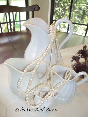I love white ironstone and just picked up the little one in front over the weekend. It was a dime. Of course I had to have it. Thought these pearls would look great instead of fresh flowers.