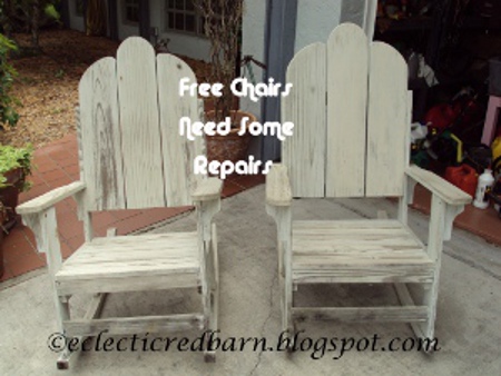 My neighbor across the street put out these rocking chairs. I went to put out some garbage and wow there they were. I got so excited, I ran over there and my neighbor happened to be out. Can I have those? Of course, they had bought new ones. They needed some repairs.
