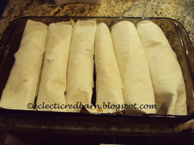 3. Roll enchiladas and place seam-side down in 9x13" baking dish that has been lightly sprayed with non-stick cooking spray.