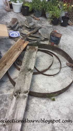 Many items that I collected where from my sons farm. The big iron wheel and the small ones were down by an old lean-to. That's were I also got some barn boards.