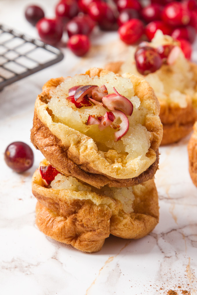 These cute little Apple and Cranberry Puffy Pancakes are the perfect breakfast on the go! Ready in under 30 minutes, you can fill them with whatever fruit you want to make an utterly delicious portable breakfast!