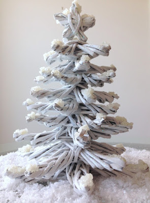 In my quest to make more recycled crafts for the holidays, I was inspired by these on Pinterest when I put this tree together. It's made of recycled newspaper tubes woven into stars made in graduated sizes and glued together.