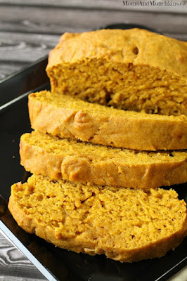 This pumpkin loaf wasn’t out of the oven for more than 15 minutes before I saw my 3 year old son picking big chunks out of the side and eating what he calls “pumpkin cake”. What happens when mom says “No pumpkin loaf before dinner”? You wait until she’s not looking and just grab chunks off the side of the loaf while it’s cooling. What a little stinker!