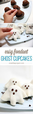 These fondant ghost cupcakes are absolutely adorable and they are SO EASY! I love a cute treat that doesn’t take a lot of effort! Make these with some chocolate covered pretzel pumpkins, some mini donut spiders and some pretzel and cheese string broomsticks and you’d have a pretty awesome spread for a Halloween party!