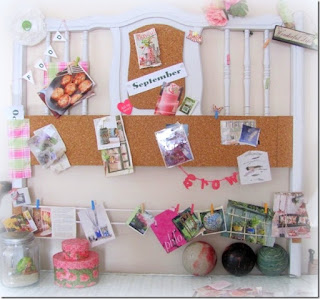 What to do with an old twin bed headboard? Why, turn it into a blog inspiration board, of course. I’ve seen some headboards turned into different things and I wanted to see what I could do with an old headboard also. I had an old bed headboard so I spray painted it and then went to town decorating it.