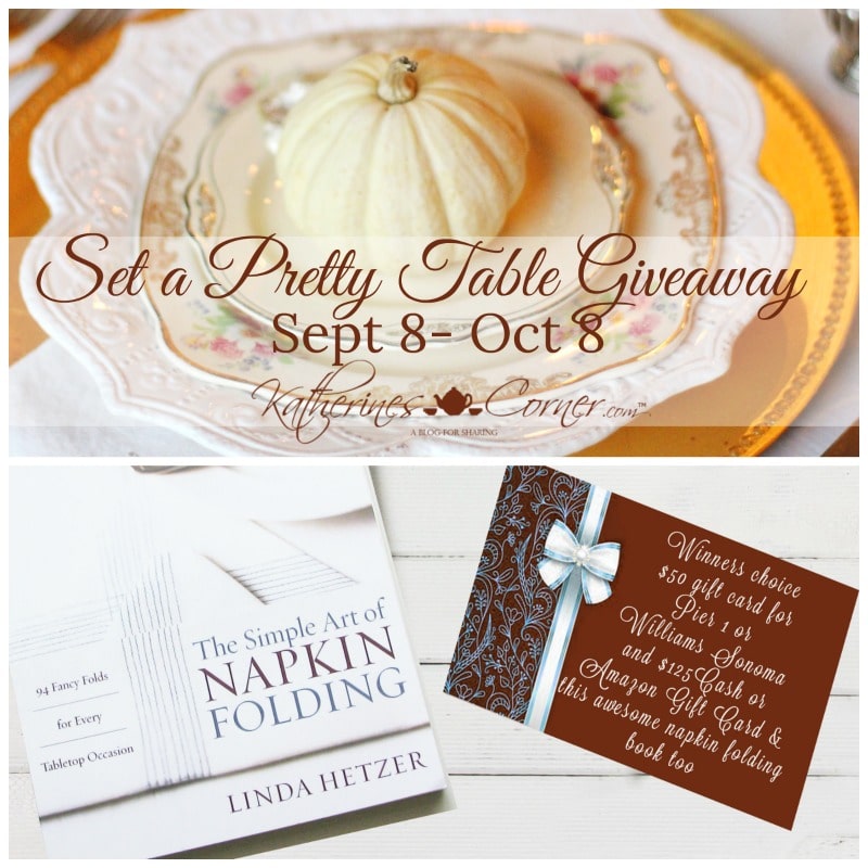 Don't forget to enter the Set A Pretty Table Giveaway. Check out the cash prize and gift cards that are available.