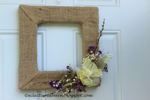 There are so many beautiful wreaths. I was thinking about what kind of wreath I wanted for my front door. As I looked at my supplies, I found some flowers I could use, but no base for the wreath.Then I found a frame, I knew it would make a great base for my wreath.