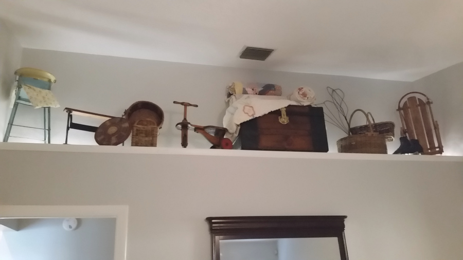 In the mist of moving, I needed to find a place for the small trunk. In our bedroom, is this space or sort of alcove above with some lights. I thought why not up there. That was the beginning. What else could be put up there. So for the next hour, I needed a break, my daughter and I decided to see what I could find to add to the truck. All of these things have special meaning to me. It is rather high up there, so it was hard to get a good picture.