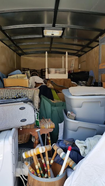I didn't have time to do a post but wanted to show you what the trailer looked like when we arrived at the house. The trailer is 26 feet long and was packed. I couldn't add height on this load since I could not pile up very high on many of the items. Nothing moved, so that was good. Like my crochet sets?