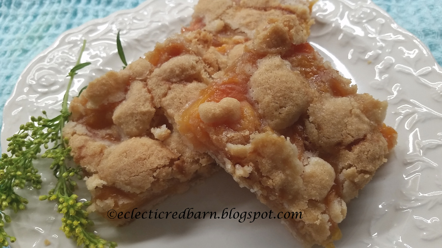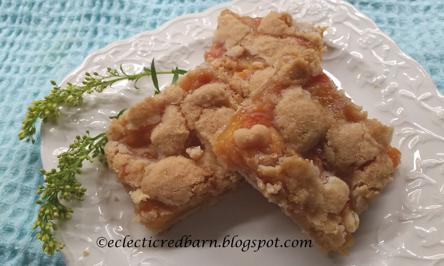 If you follow me, you know I received almost a bushel of peaches recently. We ate lots and then I put the rest in the freezer. I wanted to make something for my husband to take into work. I had seen recipes for slab pie and thought that would be great with the peaches. Instead of putting another crust on top, I crumbled sugar cookie dough on the top. How could it not be good?
