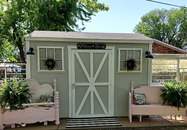 Finally we have Penny's she shed from Penny's Vintage Home. I am in love with the look of this trailer turned she-shed! It has turned out absolutely beautiful. Mr. H cut an old headboard in half, which is what you see on either side of the jut-out. Who would've thought it would look so cute. She repainted the jut-out in light grey with the pink door, and that makes the shed. I love those two colors together. The sunflower theme that runs across the shed is just perfect. If there's A/C, I could just move in!