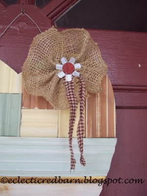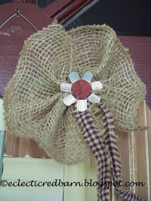Sixth: For the burlap flower, I just gathered a piece of burlap in the middle and tied a piece of string around the center.