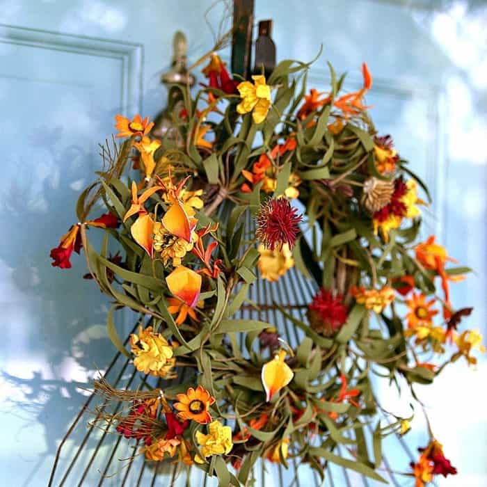 I love wreaths - I wonder how many I have now? Anyways, I immediately fell in love with this DIY Fall Rake Wreath creatively designed by Kathy of Petticoat JUNKtion. What a neat way to upcycle old items into something unique and beautiful!