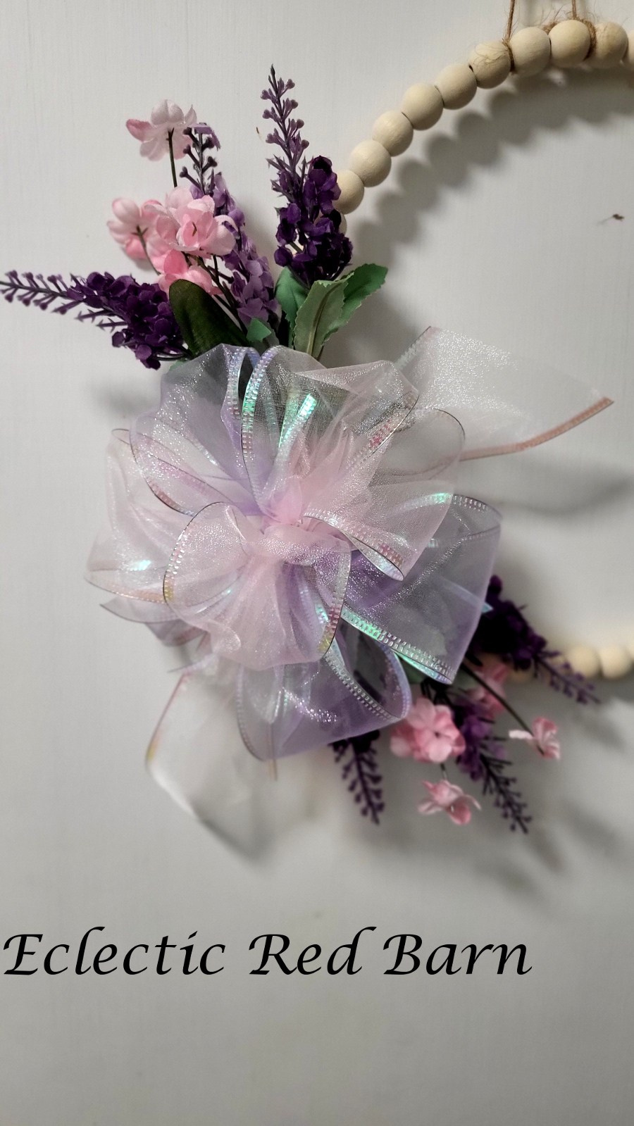I attached the flowers to the beaded wreath form. I used twine to tie the flowers onto the back of the beaded form.