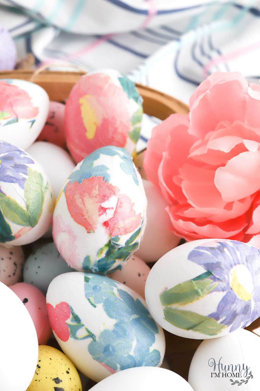 Emily of Hunny I'm Home shared how to make beautiful floral farmhouse eggs that won't stain your fingers and you never have to refrigerate. They are easy to make and will look beautiful inside baskets in Easter vignettes!
