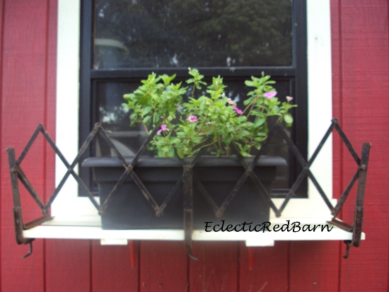 Next I decided to add some landscaping around it. I even added the window flower box in front. To create the flower box, I used two boards to make a platform to hold the planter. I painted the boards and mounted them with two L-brackets that I painted red to match the outside of the barn. In front of the flower box I mounted an antique luggage rack from a model T car. The luggage rack is expandable so I was able to widen it to fit; it made the perfect compliment for this flower box.
