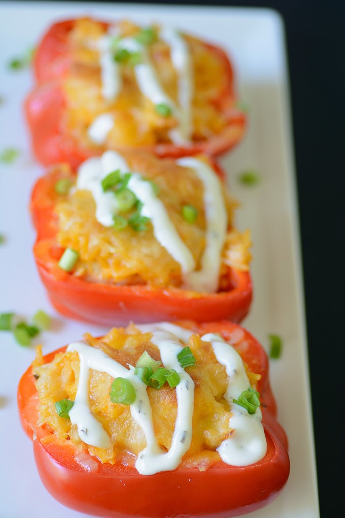 Continuing with the whole red pepper theme, I whipped up these the other day when I was really craving some buffalo chicken dip. While part of me just wanted to sit down with an entire bowl of dip and a bag of chips, my getting too tight jeans vehemently begged me to eat some veggies. So I compromised and put my yummy buffalo chicken dip inside of a veggie and added some rice (quinoa would have been better, but we were all out, gah!).