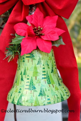 I made a bow from ribbon left over from last year. The greenery was free and the white items came from the Dollar Tree.