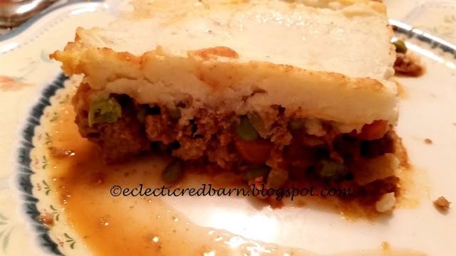 The topping is made with mashed potatoes and cabbage thus the name colcannon. This is both an Irish and Scottish dish. Sometimes it is made as a side dish and leftovers can be made into cakes, similar to potato latkes.