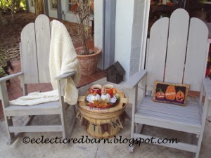 Remember those great free rocking chairs I got from my neighbor? Well, we use them all the time and I wanted to give them a fall update. I had hoped to post this before Halloween, but that never happened. As you can see, I had a Halloween pillow on one of the rockers. It has since been removed.
